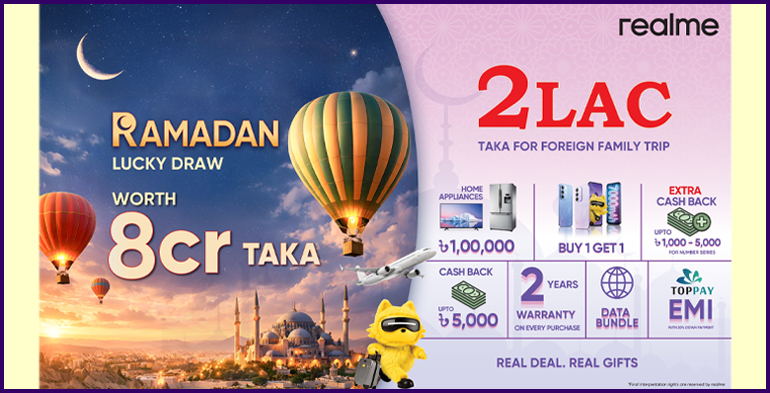 ক্যাম্পেইনের আওতায়, আজ (০১ মার্চ) থেকে শুরু করে ঈদের আগের দিন পর্যন্ত যেসব ক্রেতা নতুন রিয়েলমি স্মার্টফোন কিনবেন, তারা আকর্ষণীয় পুরস্কারসহ একটি র্যাফেল ড্রতে অংশ নেওয়ার সুযোগ পাবেন। প্রথম পুরস্কার হিসেবে বিজয়ী পাবেন ২ লাখ টাকার ফ্যামিলি ট্রাভেল প্যাকেজ, আর দ্বিতীয় পুরস্কার হিসেবে থাকছে ১ লাখ টাকার হোম অ্যাপ্লায়েন্স। নির্বাচিত কিছু মডেলে ভাগ্যবান ক্রেতাদের জন্য থাকছে বিশেষ 'একটি কিনলে একটি ফ্রি' (বোগো) অফার। এছাড়াও, অফার চলাকালে সকল ফোনে ৫,০০০ টাকার নিয়মিত ক্যাশব্যাক পাওয়ার সুযোগ থাকছে। পাশাপাশি, নাম্বার সিরিজের নির্বাচিত মডেল, অর্থাৎ রিয়েলমি ১২, ১৪টি, ১৪, ১৫টি, ১৫ ও ১৫প্রো-তে ১,০০০ টাকা থেকে শুরু করে ৫,০০০ টাকা পর্যন্ত অতিরিক্ত ক্যাশব্যাক পাওয়ার সুযোগও থাকছে।