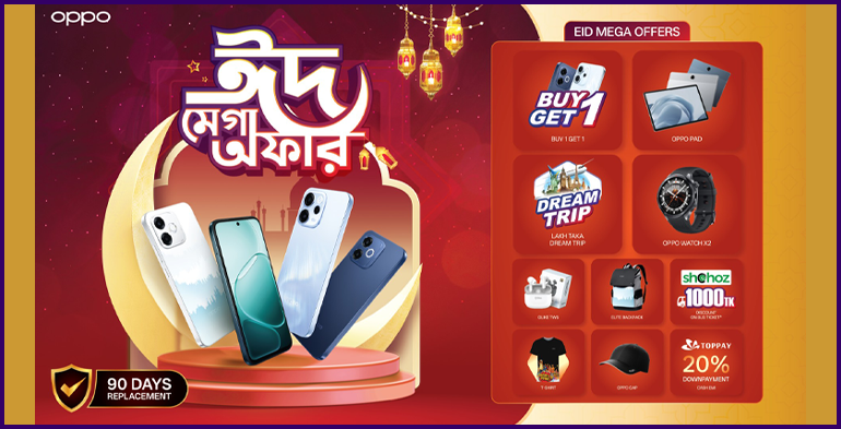 ঈদ মেগা অফার ক্যাম্পেইনের আওতায়, ক্রেতারা প্রতিটি কেনাকাটার সঙ্গে ফ্রি ৯০ দিনের রিপ্লেসমেন্ট ওয়ারেন্টি উপভোগ করবেন। পাশাপাশি, আকর্ষণীয় ঈদ উপহার হিসেবে আরও থাকছে একটি কিনলে একটি ফ্রি (বোগো) অফার, অপো প্যাড, লাখ টাকা ড্রিম ট্রিপ, অপো ওয়াচ এক্স২, ও'লাইক টিডব্লিউএস, এলিট ব্যাকপ্যাক, অপো টি-শার্ট ও অপো ক্যাপ। এছাড়াও, ক্রেতারা ন্যূনতম ২০% ডাউন-পেমেন্টে টপপে'র মাধ্যমে সহজ কিস্তি সুবিধা উপভোগ করতে পারবেন, যা এই ঈদে প্রিমিয়াম প্রযুক্তিকে আরও সহজলভ্য করে তুলবে।