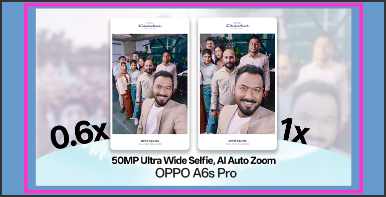 এই পরিস্থিতিতে এআই অটো জুম ফিচার ব্যবহারকারীদের জন্য একটি স্বয়ংক্রিয় সমাধান হিসেবে কাজ করে। অপোর নতুন এ৬এস প্রো-তে ৫০ মেগাপিক্সেল আল্ট্রা-ওয়াইড সেলফি ক্যামেরায় যুক্ত এই প্রযুক্তি সামনে থাকা মানুষের মুখ শনাক্ত করে ফ্রেম অনুযায়ী জুম লেভেল ঠিক করে। ফ্রেমে একজন বা দুজন থাকলে ক্যামেরা স্বাভাবিকভাবে ১x মোডে থাকে। আর ফ্রেমে মানুষের সংখ্যা বাড়লে এটি স্বয়ংক্রিয়ভাবে ০.৬x আল্ট্রা-ওয়াইড মোডে পরিবর্তিত হয়। পুরো প্রক্রিয়াটি দ্রুত সম্পন্ন হয় এবং ব্যবহারকারীকে আলাদা করে কোনো সেটিং পরিবর্তন করতে হয় না।