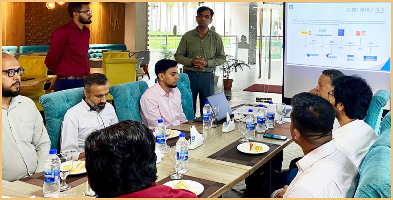 নলেজ শেয়ারিং সেশনে বি-ট্র্যাক সল্যুশনস লিমিটেডের প্রধান নির্বাহী কর্মকর্তা (সিইও) মোহাম্মদ তানভীর সিদ্দিক প্রতিষ্ঠানটির নতুন প্রযুক্তিসেবা নিয়ে কথা বলেন।