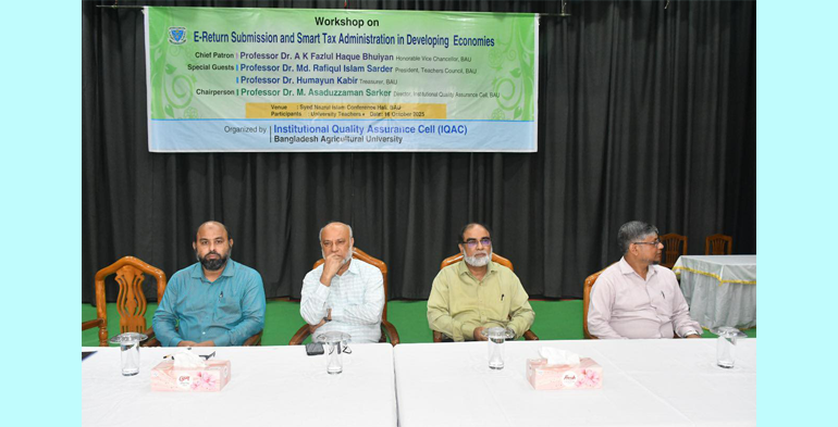 বাকৃবি প্রতিনিধি:বাংলাদেশ কৃষি বিশ্ববিদ্যালয়ে (বাকৃবি) শিক্ষকদের অনলাইন আয়কর রিটার্ন দাখিলে দক্ষতা বৃদ্ধির লক্ষ্যে দিনব্যাপী "ই-রিটার্ন সাবমিশন এন্ড স্মার্ট ট্যাক্স এডমিনিস্ট্রেশন ইন ডেভেলপিং ইকোনোমিস" শীর্ষক প্রশিক্ষণ কর্মশালা অনুষ্ঠিত হয়েছে।