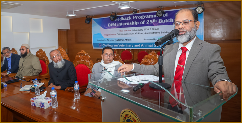 এগ্রিলাইফ২৪ ডটকম: চট্টগ্রাম ভেটেরিনারি ও এনিম্যাল সাইন্সেস বিশ্ববিদ্যালয়ের (সিভাসু) ভেটেরিনারি মেডিসিন অনুষদের ডিভিএম (ডক্টর অব ভেটেরিনারি মেডিসিন) ২৫তম ব্যাচের শিক্ষার্থীরা সম্প্রতি পাকিস্তান, ইন্দোনেশিয়া, মালয়েশিয়া, জাপান এবং বাংলাদেশের বিভিন্ন বিশ্ববিদ্যালয়, দেশের বিভিন্ন প্রাণী হাসপাতাল, চিড়িয়াখানা ও সরকারি-বেসরকারি প্রতিষ্ঠানে এক বছরের ইন্টার্নশিপ সম্পন্ন করে। এ উপলক্ষ্যে রবিবার পরিচালক (বহিরাঙ্গন কার্যক্রম) দপ্তর একটি ইন্টার্নশিপ ফিডব্যাক প্রোগ্রামের আয়োজন করে।