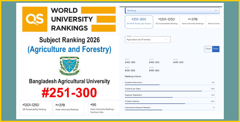 বাকৃবি প্রতিনিধি:আন্তর্জাতিক র্যাংকিংয়ে উপস্থিতি থাকলেও দৃশ্যমান অগ্রগতি না থাকায় প্রশ্ন উঠছে বাংলাদেশ কৃষি বিশ্ববিদ্যালয়ের (বাকৃবি) শিক্ষা ও গবেষণার সাম্প্রতিক মান নিয়ে। সম্প্রতি প্রকাশিত বিষয়ভিত্তিক কিউএস ওয়ার্ল্ড ইউনিভার্সিটি র্যাংকিং-২০২৬ অনুযায়ী, এগ্রিকালচার অ্যান্ড ফরেস্ট্রি বিষয়ে বিশ্ববিদ্যালয়টি টানা তিন বছর ধরে বিশ্বে ২৫১-৩০০তম অবস্থানেই রয়েছে। তবে দেশের মধ্যে শীর্ষস্থান ধরে রেখেছে প্রতিষ্ঠানটি।