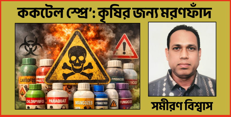 সমীরণ বিশ্বাস:বালাই দমনে ‘ককটেল স্প্রে’: কৃষির জন্য নীরব মরণফাঁদ। বাংলাদেশের কৃষি আজ নানা সম্ভাবনার পাশাপাশি বহুমুখী চ্যালেঞ্জের মুখোমুখি। আধুনিক প্রযুক্তি, উন্নত বীজ ও বৈজ্ঞানিক চাষাবাদের প্রসার যেমন কৃষিকে এগিয়ে নিচ্ছে, তেমনি অপরিকল্পিত ও অজ্ঞতাপ্রসূত কিছু চর্চা কৃষির জন্য বড় হুমকি হয়ে দাঁড়াচ্ছে। এর মধ্যে অন্যতম একটি হলো, বালাই দমনে ‘ককটেল স্প্রে’ ব্যবহার। কৃষকরা নিজেরা বিভিন্ন ধরনের কীটনাশক, ছত্রাকনাশক, মাকড়নাশক, হরমোন ও মাইক্রো-নিউট্রিয়েন্ট একসাথে মিশিয়ে নতুন ধরনের স্প্রে তৈরি করছেন, যাকে তারা ‘ককটেল’ নামে অভিহিত করছেন। এই প্রবণতা দিন দিন বাড়ছে, যা কৃষির জন্য এক নীরব মরণব্যাধিতে পরিণত হচ্ছে।