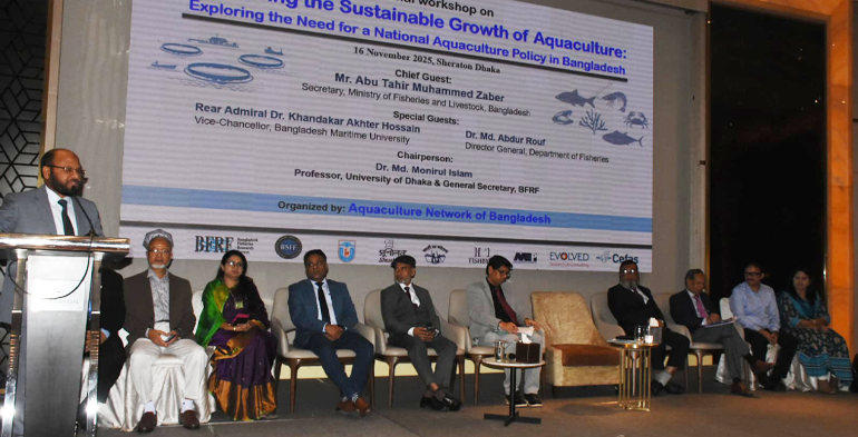 Staff Correspondent: The National Workshop on “Advancing the Sustainable Growth of Aquaculture: Exploring the Need for a National Aquaculture Policy in Bangladesh” was held on 16 November 2025 at Sheraton Dhaka, organized by the Aquaculture Network of Bangladesh (ANB) with support from CEFAS, Evolved Research Consulting, and MacAlister Elliot & Partners, UK.