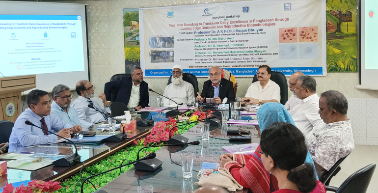 বাকৃবি প্রতিনিধি:গবাদিপশুর জেনেটিক উন্নয়ন এবং দেশীয় দুগ্ধশিল্পকে আধুনিক প্রজনন প্রযুক্তির মাধ্যমে রূপান্তরিত করার লক্ষ্যে বাংলাদেশ কৃষি বিশ্ববিদ্যালয়ে (বাকৃবি) প্রিসিশন ব্রিডিং ভিত্তিক দুগ্ধ উৎপাদন উন্নয়ন বিষয়ক উদ্বোধনী কর্মশালা অনুষ্ঠিত হয়েছে। শনিবার (১৫ নভেম্বর) বিশ্ববিদ্যালয়ের পশুপালন অনুষদের ডিন অফিসের সম্মেলন কক্ষে এ কর্মশালার আয়োজন করা হয়।