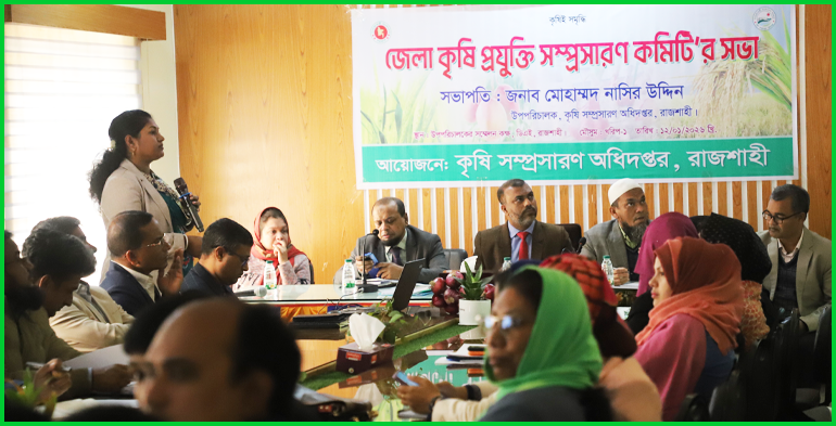 মো: এমদাদুল হক:রাজশাহীকৃষি সম্প্রসারণ অধিদপ্তরের আয়োজনে গতকাল সোমবার ১২ জানুয়ারি সকাল ১০টায় রাজশাহী কৃষি সম্প্রসারণ অধিদপ্তরের উপপরিচালকের সম্মেলন কক্ষে খরিপ-১/২০২৬-২৭ মৌসুমের মৌসুমের কর্মপরিকল্পনা নিয়ে কৃষি প্রযুক্তি সম্প্রসারণ কমিটির সভা অনুষ্ঠিত হয়। সভায় সভাপতিত্ব করেন রাজশাহী কৃষি সম্প্রসারণ অধিদপ্তরের উপপরিচালক কৃষিবিদ মোহাম্মদ নাসির উদ্দিন এতে রাজশাহী জেলার কৃষি সংশ্লিষ্ট অধিদপ্তরের কর্মকর্তা, বেসরকারি কর্মকর্তা, বিসিআইসি সার ডিলার, কীটনাশক ডিলার কৃষি উদ্যোক্তা ও অন্যান্য অংশীজন সভায় উপস্থিত ছিলেন।
