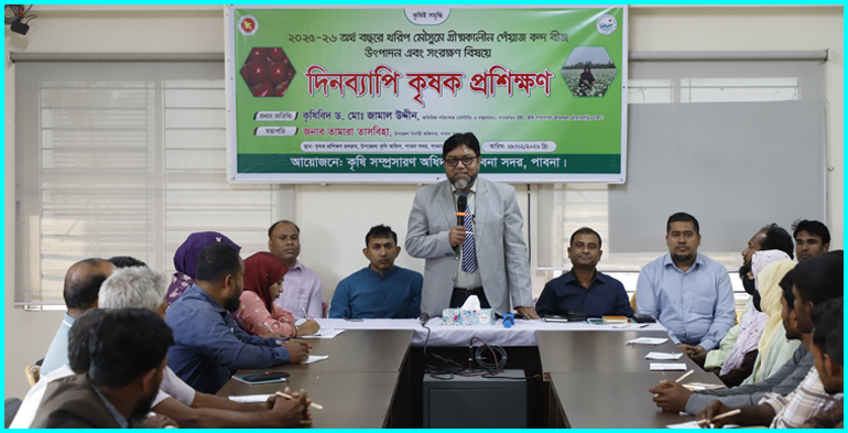 মোঃ গোলাম আরিফঃ পাবনা সদরে ২০২৫-২৬ অর্থ বছরে খরিপ মৌসুমে গ্রীষ্মকালীন পেঁয়াজ কন্দ বীজ উৎপাদন এবং সংরক্ষণ বিষয়ে দিনব্যাপি প্রশিক্ষণ অনুষ্ঠিত হয়েছে। ২৮ ফেব্রুয়ারি ২০২৬ উপজেলা কৃষি অফিসারের কার্যালয়, পাবনা সদর, পাবনা’র প্রশিক্ষণ হলে এ প্রশিক্ষণের আয়োজন করা হয়। দিনব্যাপি প্রশিক্ষণে প্রধান অতিথি হিসেবে উপস্থিত ছিলেন কৃষি সম্প্রসারণ অধিদপ্তরের সরেজমিন উইংয়ের অতিরিক্ত পরিচালক (মনিটরিং ও বাস্তবায়ন) কৃষিবিদ ড. মোঃ জামাল উদ্দীন।