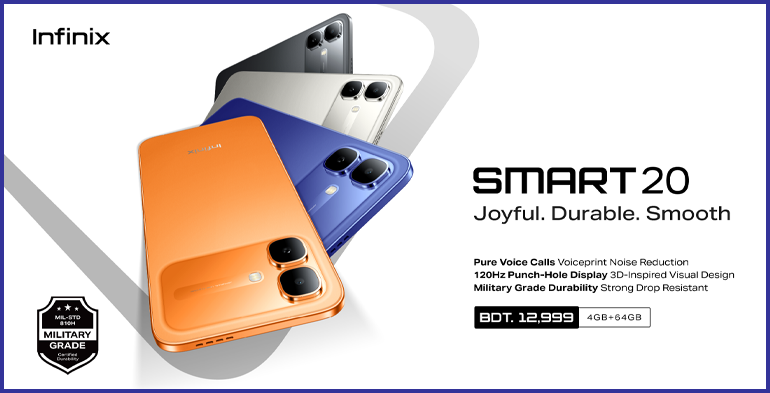 এগ্রিলাইফ২৪ ডটকম: ইনফিনিক্স বাংলাদেশে আনুষ্ঠানিকভাবে উন্মোচন করেছে তাদের নতুন স্মার্টফোন 'ইনফিনিক্স স্মার্ট ২০'। স্মার্টফোনটি এন্ট্রি-লেভেল সেগমেন্টে যুক্ত করেছে আধুনিক ভয়েসপ্রিন্ট নয়েজ রিডাকশন প্রযুক্তি, যা পরিষ্কার ভয়েস কল নিশ্চিত করতে বিশেষভাবে তৈরি। টেকসই, স্মুথ ডিসপ্লে এবং ব্যবহারবান্ধব ডিজাইনের সমন্বয়ে স্মার্ট ২০ তৈরি করা হয়েছে দৈনন্দিন বাস্তব চাহিদার কথা মাথায় রেখে।