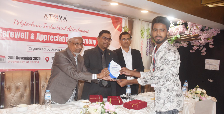 এগ্রিলাইফ২৪ ডটকম: শিল্পভিত্তিক প্রশিক্ষণ সম্পন্নকারী প্রশিক্ষণার্থীদের জন্য 'ইন্ডাস্ট্রিয়াল ট্রেনিং, ফেয়ারওয়েল অ্যান্ড অ্যাপ্রিসিয়েশন সেরিমনি' আয়োজন করেছে এটোভা টেকনোলজি। বুধবার (২৬ নভেম্বর) রাতে রাজধানীর একটি অভিজাত রেস্টুরেন্টে আয়োজিত এ অনুষ্ঠানে প্রশিক্ষণার্থীদের সনদপত্র ও সম্মাননা স্মারক প্রদান করা হয়।
