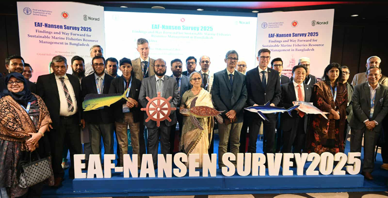 Agrilife24.com:The Government of Bangladesh today presented the key findings of the EAF-Nansen Survey 2025, conducted by the internationally renowned research vessel R.V. Dr. Fridtjof Nansen, during a national debriefing session at Hotel Intercontinental. The month-long survey, carried out from 21 August to 21 September 2025 with the participation of 45 scientists, including 13 from Bangladesh, assessed fish stock abundance, biodiversity patterns and environmental conditions in the Bay of Bengal under the FAO–Norway supported EAF-Nansen Programme.