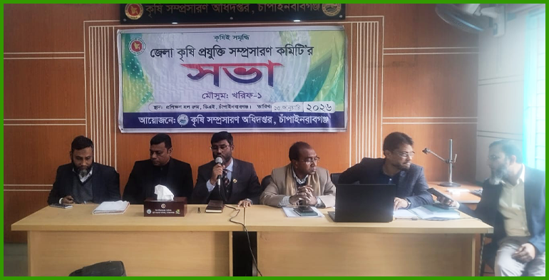 মো: আমিনুল ইসলাম:চাঁপাইনবাবগঞ্জ কৃষি সম্প্রসারণ অধিদপ্তরের আয়োজনে গত বৃহস্পতিবার ১৫ জানুয়ারি সকাল ১০টায় চাঁপাইনবাবগঞ্জ কৃষি সম্প্রসারণ অধিদপ্তরের উপপরিচালকের সম্মেলন কক্ষে খরিপ-১/২০২৬-২৭ মৌসুমের মৌসুমের কর্মপরিকল্পনা নিয়ে কৃষি প্রযুক্তি সম্প্রসারণ কমিটির সভা অনুষ্ঠিত হয়। সভায় সভাপতিত্ব করেন চাঁপাইনবাবগঞ্জ কৃষি সম্প্রসারণ অধিদপ্তরের উপপরিচালক কৃষিবিদ ড. মো: ইয়াছিন আলী । এতে চাঁপাইনবাবগঞ্জ জেলার কৃষি সংশ্লিষ্ট অধিদপ্তরের কর্মকর্তা, বেসরকারি কর্মকর্তা, বিসিআইসি সার ডিলার, কীটনাশক ডিলার, কৃষি উদ্যোক্তা ও অন্যান্য অংশীজন সভায় উপস্থিত ছিলেন।