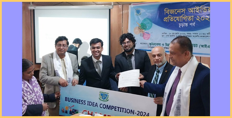 বাকৃবি প্রতিনিধি:বাংলাদেশ কৃষি বিশ্ববিদ্যালয়ে (বাকৃবি) শিক্ষার্থীদের উদ্যোক্তা মানস গড়ে তুলতে আয়োজিত 'বিজনেস আইডিয়া প্রতিযোগিতা ২০২৪'-এর চূড়ান্ত পর্ব ও পুরস্কার বিতরণী অনুষ্ঠিত হয়েছে। কৃষিব্যবসা ও উন্নয়ন শিক্ষা ইনস্টিটিউট (আইএডিএস)-এর উদ্যোগে আয়োজিত এই প্রতিযোগিতায় চ্যাম্পিয়ন হয় টিম 'গ্রীন ডাই'।