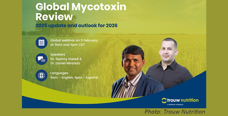 Agrilife24.com:Trouw Nutrition has announced that it will present key findings from its 2025 Global Mycotoxin Review during a live online event scheduled for 5 February. The annual review is based on around 120,000 mycotoxin analyses of raw materials, grains, complete feeds and silages collected globally in 2025. The webinar will highlight global contamination trends, emerging mycotoxin risks, and data-driven mitigation strategies to support feed safety and effective risk management looking ahead to 2026.