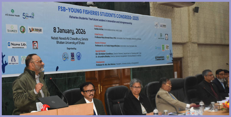 রাজধানী প্রতিনিধি: দেশের মৎস্যখাতের ভবিষ্যৎ নেতৃত্ব গড়ে তোলা ও তরুণ মৎস্যবিজ্ঞান শিক্ষার্থীদের দক্ষতা উন্নয়নের লক্ষ্যে Young Fisheries Students Congress (YFSC)-2025 শীর্ষক একটি কনফারেন্স অনুষ্ঠিত হয়েছে। ফিশারিজ সোসাইটি অব বাংলাদেশ (এফএসবি), ঢাকা বিশ্ববিদ্যালয়ের মৎস্যবিজ্ঞান বিভাগ এবং বাংলাদেশ ফিশারিজ এক্সিকিউটিভ এসোসিয়েশন (বিএফইএ)-এর যৌথ উদ্যোগে আজ বৃহস্পতিবার (৮ জানুয়ারি ২০২৬) ঢাকা বিশ্ববিদ্যালয়ের Nabab Nawab Ali Chowdhury Senate Bhaban-এ এই কনফারেন্স আয়োজন করা হয়।