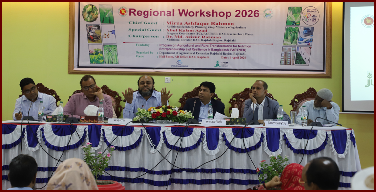 মো. এমদাদুল হকঃ কৃষি উন্নয়ন, পুষ্টি নিরাপত্তা, উদ্যোক্তা সৃষ্টি এবং টেকসই কৃষি ব্যবস্থার প্রসারের লক্ষ্যে রাজশাহী অঞ্চলে “পার্টনার” প্রকল্পের আওতায় দিনব্যাপী আঞ্চলিক কর্মশালা অনুষ্ঠিত হয়েছে। আজ সোমবার (৬ এপ্রিল) কৃষি সম্প্রসারণ অধিদপ্তর, রাজশাহী অঞ্চলের আঞ্চলিক কার্যালয়ের কনফারেন্স রুমে আয়োজিত এ কর্মশালার আয়োজন করে কৃষি সম্প্রসারণ অধিদপ্তর এবং “Program on Agricultural and Rural Transformation for Nutrition, Entrepreneurship and Resilience in Bangladesh (PARTNER)” প্রকল্পের অর্থায়নে কর্মশালাটি পরিচালিত হয়।