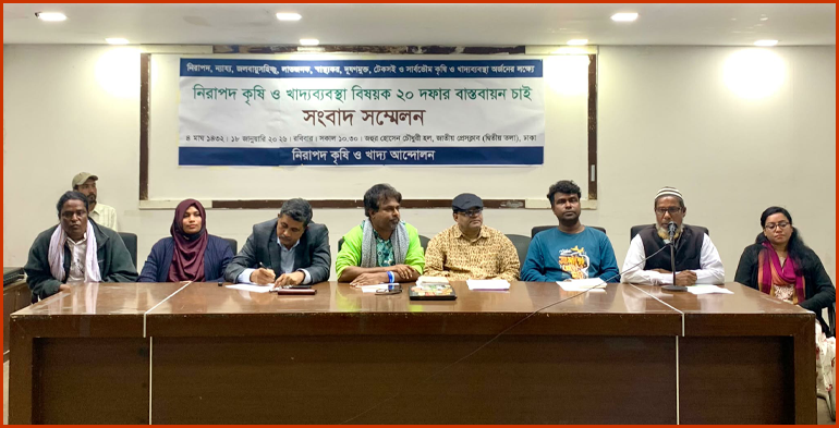 এগ্রিলাইফ২৪ ডটকম: নিরাপদ, ন্যায্য, জলবায়ুসহিষ্ণু, লাভজনক, স্বাস্থ্যকর, দূষণমুক্ত, টেকসই ও সার্বভৌম কৃষি ও খাদ্য ব্যবস্থা গড়ে তোলার লক্ষ্যে নিরাপদ কৃষি ও খাদ্য বিষয়ক ২০ দফা বাস্তবায়নের দাবি জানিয়ে রাজধানীতে এক সংবাদ সম্মেলন অনুষ্ঠিত হয়েছে। রবিবার ১৮ জানুয়ারি ২০২৬ সকাল ১০টা ৩০ মিনিটে জাতীয় প্রেস ক্লাবের জহুর হোসেন চৌধুরী হলে (২য় তলা) ‘নিরাপদ কৃষি ও খাদ্য আন্দোলন’-এর উদ্যোগে এ সংবাদ সম্মেলনের আয়োজন করা হয়।