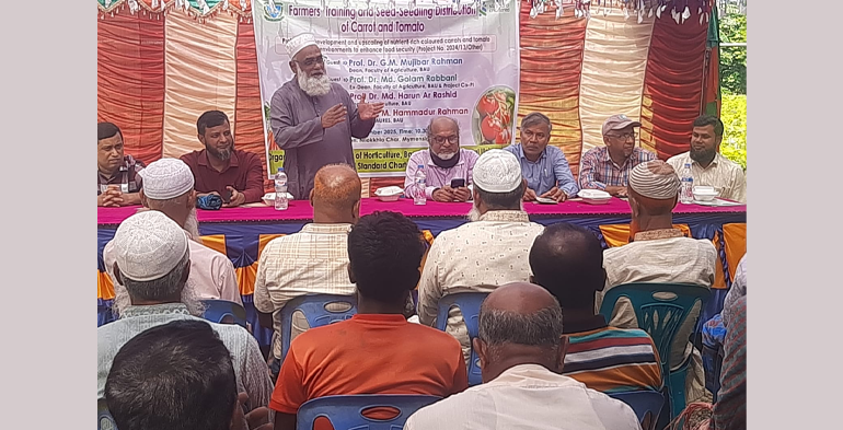 বাকৃবি প্রতিনিধি: বাংলাদেশ কৃষি বিশ্ববিদ্যালয়ের (বাকৃবি) উদ্যানতত্ত্ব বিভাগ এবং স্ট্যান্ডার্ড চার্টার্ড ব্যাংকের উদ্যোগে মাঠ পর্যায়ে গাজর ও টমেটো উৎপাদন বিষয়ে কৃষকদের জন্য প্রশিক্ষণ আয়োজন এবং বীজ ও চারা বিতরণ করা হয়েছে। এসময় কৃষকদের মাঝে তিন হাজার টমেটোর চারা এবং কৃষক প্রতি দুই শতাংশ জমিতে বপনযোগ্য ৫০ গ্রাম করে গাজরের বীজ প্রদান করা হয়।