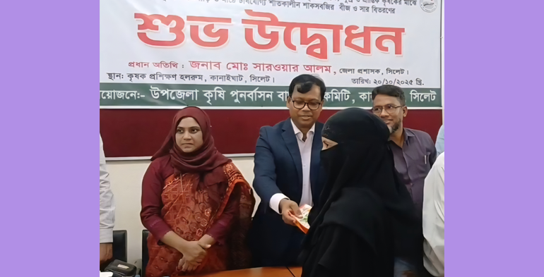 এগ্রিলাইফ২৪ ডটকম:আজ ২০ অক্টোবর ২০২৫ সিলেটের কানাইঘাটে ২০২৫-২৬ অর্থবছরে রবি মৌসুমে সবজি আবাদ ও উৎপাদন বৃদ্ধির লক্ষ্যে ক্ষুদ্র ও প্রান্তিক কৃষকের মাঝে বিনামূল্যে বসতবাড়ি ও মাঠে চাষযোগ্য শীতকালীন শাক সবজির বীজ ও সার বিতরণের শুভ উদ্বোধন করা হয়। অনুষ্ঠানে প্রধান অতিথি হিসেবে উপস্থিত ছিলেন সিলেটের জেলা প্রশাসক জনাব মোঃ সারওয়ার আলম।