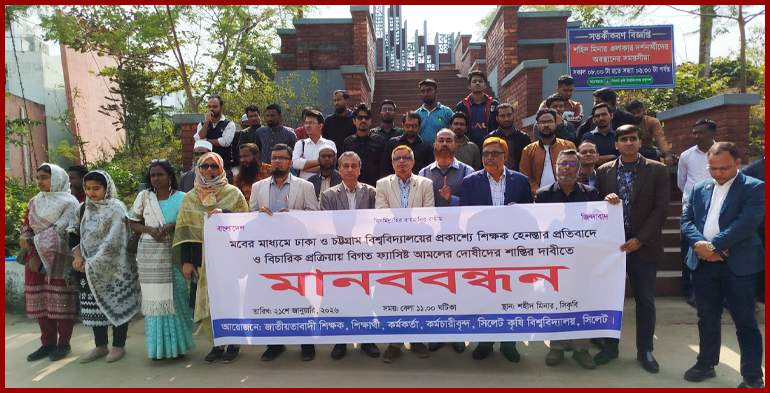 সিকৃবি প্রতিনিধি: ঢাকা ও চট্টগ্রাম বিশ্ববিদ্যালয়ে প্রকাশ্যে শিক্ষক হেনস্তার ঘটনার প্রতিবাদ এবং বিচারিক প্রক্রিয়ায় ফ্যাসিস্ট আমলের দোষীদের দৃষ্টান্তমূলক শাস্তির দাবিতে সিলেট কৃষি বিশ্ববিদ্যালয়ে (সিকৃবি) মানববন্ধন অনুষ্ঠিত হয়েছে। আজ সকাল ১১টায় জাতীয়তাবাদী শিক্ষক, কর্মকর্তা, কর্মচারী ও ছাত্রছাত্রীদের ব্যানারে সিকৃবি কেন্দ্রীয় শহীদ মিনার প্রাঙ্গণে এ মানববন্ধন অনুষ্ঠিত হয়। মানববন্ধন শেষে প্রফেসর ড. মো: এমদাদুল হকের সভাপতিত্বে এবং প্রফেসর ড. শাহানা বেগমের উপস্থাপনায় একটি সমাবেশ অনুষ্ঠিত হয়।