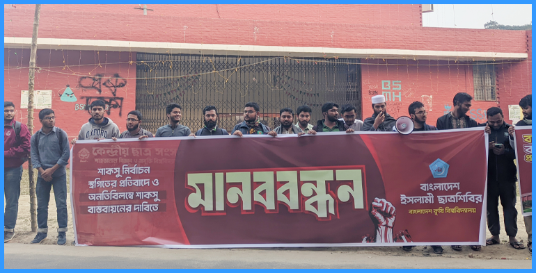 বাকৃবি প্রতিনিধি:শাহজালাল বিজ্ঞান ও প্রযুক্তি বিশ্ববিদ্যালয় ছাত্র সংসদ (শাকসু) নির্বাচন স্থগিতের প্রতিবাদে এবং অবিলম্বে নির্বাচনের দাবিতে মানববন্ধন পালন করেছে বাংলাদেশ ইসলামী ছাত্রশিবিরের বাংলাদেশ কৃষি বিশ্ববিদ্যালয় (বাকৃবি) শাখা। এসময় দীর্ঘদিন ধরে বন্ধ থাকা বাকৃবি কেন্দ্রীয় ছাত্র সংসদ (বাকসু) নির্বাচনও দাবি করা হয়।