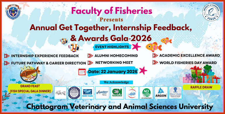 এগ্রিলাইফ২৪ ডটকম: চট্টগ্রাম ভেটেরিনারি ও এনিম্যাল সাইন্সেস বিশ্ববিদ্যালয় (সিভাসু) এর মাৎস্যবিজ্ঞান অনুষদের উদ্যোগে আগামী ২২ জানুয়ারি ২০২৬, বৃহস্পতিবার বিশ্ববিদ্যালয় ক্যাম্পাস প্রাঙ্গণে প্রথমবারের মতো অনুষ্ঠিত হতে যাচ্ছে "Annual Get-Together, Internship Feedback and Award Gala-2026"। দিনব্যাপী এই আয়োজনের মাধ্যমে শিক্ষার্থী, অ্যালামনাই, শিক্ষক এবং দেশের মৎস্যখাত সংশ্লিষ্ট বিভিন্ন অংশীজনদের মধ্যে কার্যকর সংযোগ ও অভিজ্ঞতা বিনিময়ের সুযোগ সৃষ্টি করা হবে।