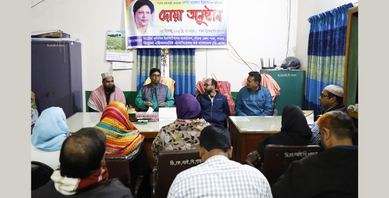 মোঃ গোলাম আরিফঃ বিএনপি চেয়ারপার্সন ও সাবেক প্রধানমন্ত্রী বেগম খালেদা জিয়ার রোগমুক্তি কামনায় আলোচনা সভা ও দোয়া মাহফিল অনুষ্ঠিত হয়েছে। আজ বুধবার ০৩ ডিসেম্বর বাদ আছর ডিপ্লোমা কৃষিবিদ ইনস্টিটিউশন বাংলাদেশ, পাবনা জেলা শাখা এ দোয়ার আয়োজন করেন।