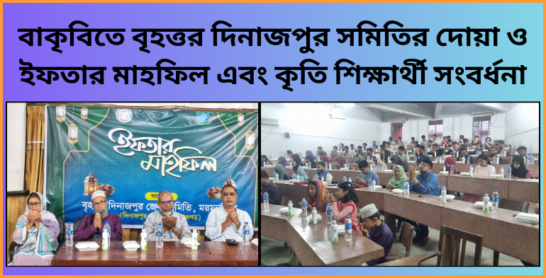 বাকৃবি প্রতিনিধিঃ বাংলাদেশ কৃষি বিশ্ববিদ্যালয়ে (বাকৃবি) বৃহত্তর দিনাজপুর সমিতির উদ্যোগে দোয়া ও ইফতার মাহফিল এবং কৃতি শিক্ষার্থী সংবর্ধনা অনুষ্ঠিত হয়েছে। বৃহস্পতিবার (৫ মার্চ) বিকেলে বিশ্ববিদ্যালয়ের কৃষি অর্থনীতি ও গ্রামীণ সমাজবিজ্ঞান অনুষদের গ্যালারিতে এ অনুষ্ঠানের আয়োজন করা হয়।