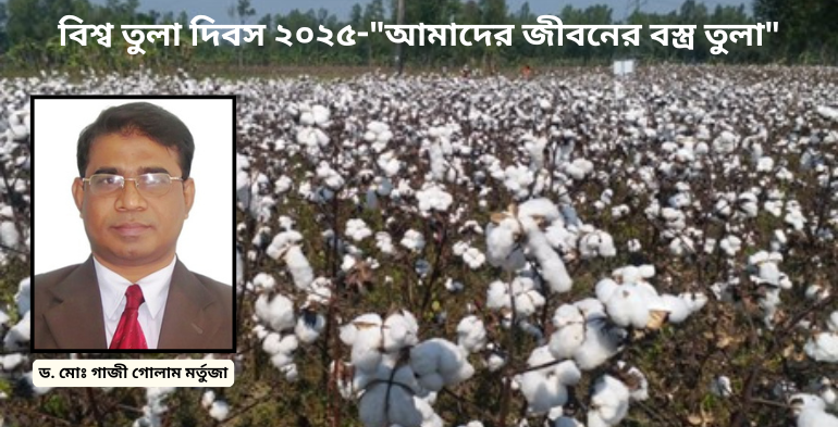 ড. মোঃ গাজী গোলাম মর্তুজা: “আমাদের জীবনের বস্ত্র তুলা” এই প্রতিপাদ্যকে সামনে রেখে বিগত কয়েক বছরের মত এ বছর ও পালিত হচ্ছে বিশ্ব তুলা দিবস ২০২৫। বিশ্বব্যাপী এই দিবসটি উদযাপনের উদ্দেশ্য হল, তুলা এবং তুলা-সম্পর্কিত পণ্যের গুরুত্ব সম্পর্কে সচেতনতা বৃদ্ধি করা, স্বল্পোন্নত দেশগুলিতে অর্থনৈতিক উন্নয়ন এবং দারিদ্র্য বিমোচনে তুলার গুরুত্বপূর্ণ ভূমিকা তুলে ধরা এবং তুলার আন্তর্জাতিক বাণিজ্যকে উৎসাহিত করা এবং উন্নয়নশীল এবং স্বল্পোন্নত দেশগুলিকে তুলা শিল্পের সাপ্লাই চেইন থেকে উপকৃত হতে সক্ষম করা। মানুষের মৌলিক চাহিদাগুলো হলো খাদ্য, বস্ত্র, বাসস্থান, চিকিৎসা ও শিক্ষা। সভ্যতার দিক থেকে বিবেচনায় বস্ত্রই হচ্ছে আমাদের প্রথম মৌলিক চাহিদা। এই বস্ত্র শিল্পের মূল ও প্রধান উপাদান তুলা।