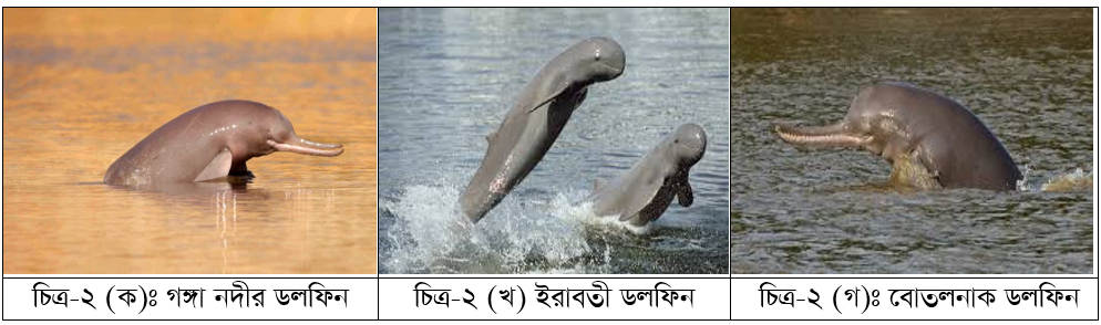 বাংলাদেশের নদ-নদীতে বসবাসকারী অল্প সংখ্যক ডলফিনের মধ্যে রয়েছে শুশুক বা গাঙ্গেয় ডলফিন (Platanista gangetica) (চিত্র-২(ক))। শুশুক ছাড়াও বাংলাদেশের নদীতে আরেক ধরনের যে ডলফিন পাওয়া যায় তার নাম ইরাবতী ডলফিন (Orcaella brevirostris) (চিত্র-২(খ)) যা মহাসাগরীয় ডলফিনের ইউরিহ্যালাইন (অর্থাৎ বিভিন্ন লবণাক্ততা সহ্যকারী) প্রজাতি। দেশের সুন্দরবন এবং এর সংলগ্ন উপকূলীয় জলরাশিতে সবচেয়ে বেশি সংখ্যক ডলফিন বাস করে। কারণ সুন্দরবণ এক অন্যন্য স্থান, যা এশিয়াতে মিষ্টি পানির ডলফিনের শেষ দুই প্রজাতিকে লালন করছে। এরা হলো শুশুক ও গোল মাথার ইরাবতী ডলফিন। শুশুক একটি মিষ্টি পানির ডলফিন যা সুন্দরবন ছাড়াও আমাদের দেশের বড় বড় নদীতেও দেখা যায়। এই ডলফিনটি প্রায় বিপন্ন। বাঁকানো ঠোঁটের কারণে মনে হয় ইরাবতী ডলফিন সারাক্ষণ হাসছে। পৃথিবীর অন্যান্য দেশের তুলনায় বাংলাদেশে বেশী ইরাবতী ডলফিন রয়েছে। মায়ানমারসহ অনেক দেশেই মাছ শিকার করতে ইরাবতী ডলফিনের সাহায্য নেয়া হয়। এছাড়া মালয়েশিয়া, ফিলিাপাইন, ভারত ও নেপালেও ডলফিন পাওয়া যায়।