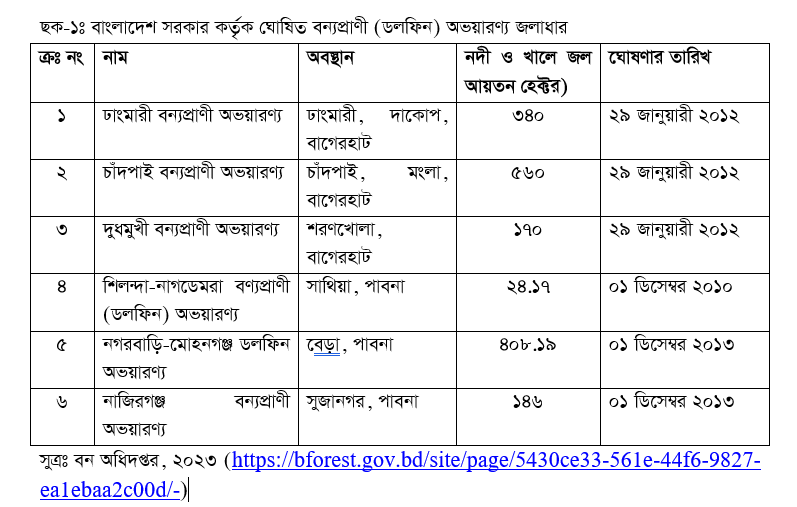 বাংলাদেশে ডলফিনের জন্য সুন্দরবন খুবই গুরুত্বপূর্ণ অঞ্চল। পূর্ব সুন্দরবনে ঘোষিত বন্যপ্রাণী (ডলফিন) অভয়ারণ্য গুলো হলোঃ
