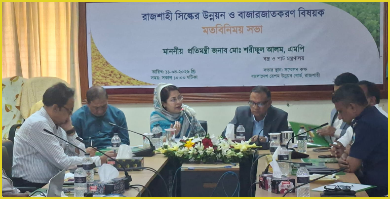 শনিবার (১১ এপ্রিল) বাংলাদেশ রেশম উন্নয়ন বোর্ডের আয়োজনে 'রাজশাহী সিল্কের উন্নয়ন ও বাজারজাতকরণ' বিষয়ে মতবিনিময় সভায় প্রধান অতিথি'র বক্তব্যে বস্ত্র ও পাট মন্ত্রণালয়ের প্রতিমন্ত্রী মো: শরীফুল আলম, এমপি এসব কথা বলেন। এর আগে সকালে 'রাজশাহীর রেশম গবেষণা ও প্রশিক্ষণ ইনস্টিটিউট, রেশম বোর্ডের কারখানা পরিদর্শন করেন তিনি।