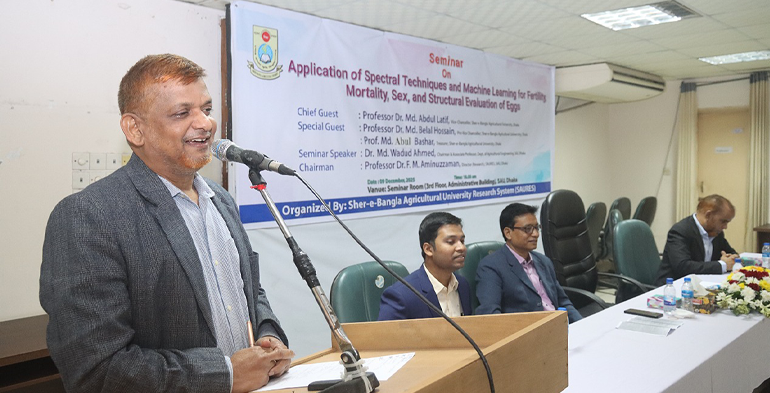 এগ্রিলাইফ২৪ ডটকম: শেরেবাংলা কৃষি বিশ্ববিদ্যালয়ের রিসার্চ সিস্টেম-এর উদ্যোগে আয়োজিত “Application of Spectral Techniques and Machine Learning for Fertility, Mortality, Sex, and Structural Evaluation of Eggs” শীর্ষক সেমিনার আজ অনুষ্ঠিত হয়। অনুষ্ঠানে মূল প্রবন্ধ উপস্থাপন করেন কৃষি প্রকৌশল বিভাগের চেয়ারম্যান ও University of Illinois Urbana-Champaign থেকে সদ্য পিএইচডি সম্পন্নকারী ড. মোঃ ওয়াদুদ আহমেদ।