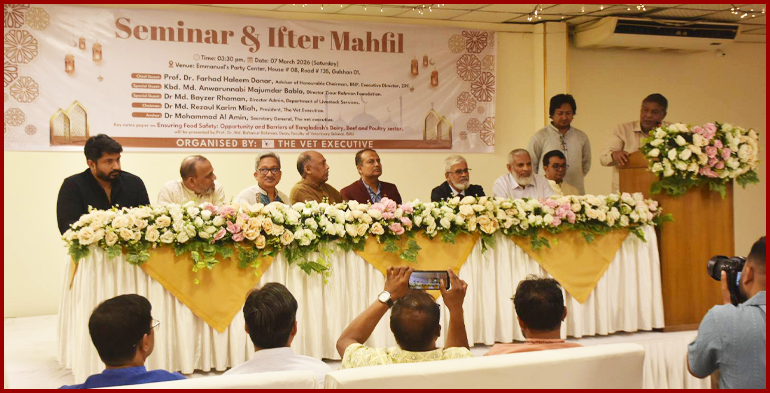 Staff correspondent: A seminar and Iftar Mahfil was held on today (7 March), at Emmanuelles Party Center in Gulshan-1, organized by The Vet Executive. The program brought together veterinary professionals, policymakers, and stakeholders to discuss critical issues in Bangladesh’s livestock and food safety sectors.