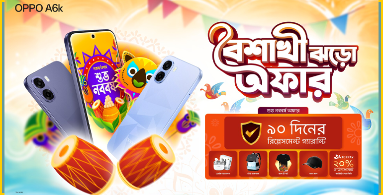 পহেলা বৈশাখ উদযাপন উপলক্ষে অপো এ৬কে কিনলেই থাকছে আকর্ষণীয় অফার। ডিভাইসটি কিনলেই ক্রেতারা ৯০ দিনের নিশ্চিত রিপ্লেসমেন্ট গ্যারান্টি ও ২ বছরের ওয়ারেন্টি সুবিধা গ্রহণের সুযোগ পাবেন। এছাড়াও, একটি বিশেষ লটারি ক্যাম্পেইনের মাধ্যমে ও'লাইক এয়ারবাডস, এলিট ব্যাকপ্যাক, অপো টিশার্ট ও অপো ক্যাপ জিতে নেওয়ার সুযোগ পাবেন ক্রেতারা। একইসাথে, টপপের মাধ্যমে সর্বোচ্চ ২০% ডাউন পেমেন্টে কার্ডলেস ইএমআই সুবিধাও পাবেন তারা।