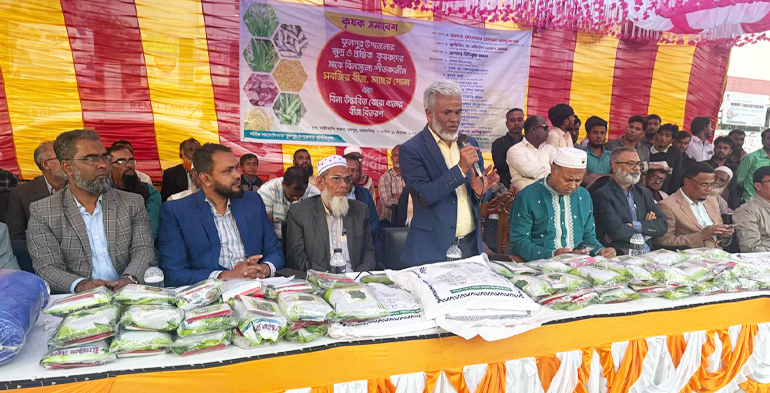 এগ্রিলাইফ প্রতিনিধি: গতকাল বৃহস্পতিবার, ১১ ডিসেম্বর ২০২৫, ময়মনসিংহের ফুলপুর উপজেলার ভাইটকান্দি বাজারে অনুষ্ঠিত হলো এক প্রাণবন্ত *কৃষক সমাবেশ, যেখানে ক্ষুদ্র ও প্রান্তিক কৃষকদের মাঝে বিনামূল্যে শীতকালীন সবজির বীজ, মাছের পোনা, বিনা উদ্ভাবিত বোরো ধানের বীজ ও টি-শার্ট বিতরণ করা হয়। কৃষকদের উৎপাদন খরচ কমিয়ে স্বনির্ভরতা অর্জনে সহায়তা করাই ছিল এই উদ্যোগের মূল লক্ষ্য।