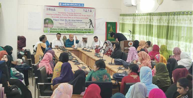 Agrilife24.com:In a timely initiative to address a critical public safety issue, the Rotary Club of Rajshahi Central, in collaboration with the Rajshahi Mohila Technical Training Centre (TTC), successfully organized a vocational training workshop on snake identification, snake rescue, and the treatment of snake bites. The event was held on Sunday, August 25, at 4:00 PM at the Mohila TTC campus.
