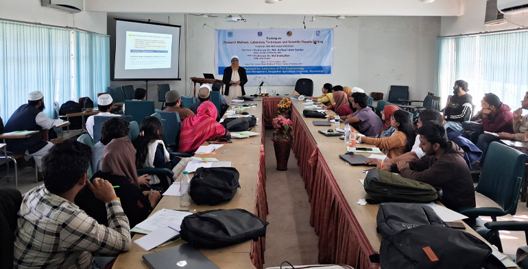 ইউজিসি-হিট প্রকল্পের অর্থায়নে এ কর্মশালার আয়োজন করে মৎস্য একোফিজিওলজি ল্যাব। দুই দিনব্যাপী প্রশিক্ষণে গবেষণার আধুনিক পদ্ধতি, ল্যাবভিত্তিক কার্যকর কৌশল এবং আন্তর্জাতিক মানের বৈজ্ঞানিক প্রতিবেদন ও গবেষণা প্রবন্ধ লেখার বিভিন্ন দিক নিয়ে বিস্তারিত আলোচনা করা হয়।