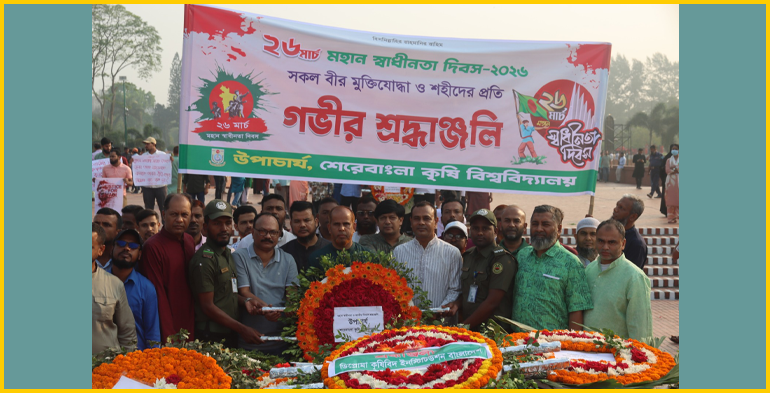 শেকৃবি প্রতিনিধি:যথাযোগ্য মর্যাদা ও গভীর শ্রদ্ধার মধ্য দিয়ে শেরেবাংলা কৃষি বিশ্ববিদ্যালয়ে (শেকৃবি) মহান স্বাধীনতা ও জাতীয় দিবস ২০২৬ উদযাপিত হয়েছে।