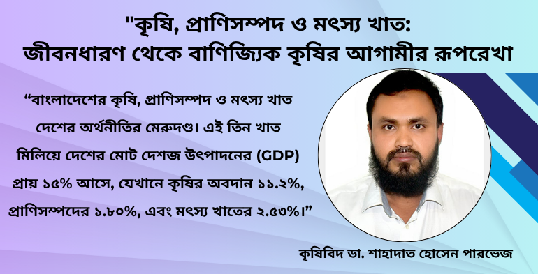 কৃষিবিদ ডা. শাহাদাত হোসেন পারভেজ: বাংলাদেশের কৃষি, প্রাণিসম্পদ ও মৎস্য খাত দেশের অর্থনীতির মেরুদণ্ড। এই তিন খাত মিলিয়ে দেশের মোট দেশজ উৎপাদনের (GDP) প্রায় ১৫% আসে, যেখানে কৃষির অবদান ১১.২%, প্রাণিসম্পদের ১.৮০%, এবং মৎস্য খাতের ২.৫৩%। এ ছাড়া দেশের মোট কর্মসংস্থানের প্রায় ৪০% মানুষ প্রত্যক্ষ বা পরোক্ষভাবে এই তিন খাতের সঙ্গে সম্পৃক্ত।অর্থাৎ, এই তিনটি খাত শুধুমাত্র খাদ্য নিরাপত্তাই নয়, গ্রামীণ অর্থনীতির স্থিতিশীলতা, দারিদ্র্য হ্রাস ও জাতীয় প্রবৃদ্ধির প্রধান চালিকাশক্তি।