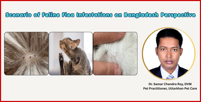 Flea infestation in cats is a widespread and significant problem in Bangladesh due to favorable environmental conditions, high stray animal populations, and inadequate preventive practices. The primary causative agent, Ctenocephalides felis, not only causes irritation and dermatitis in cats but also plays a role in transmitting zoonotic diseases.