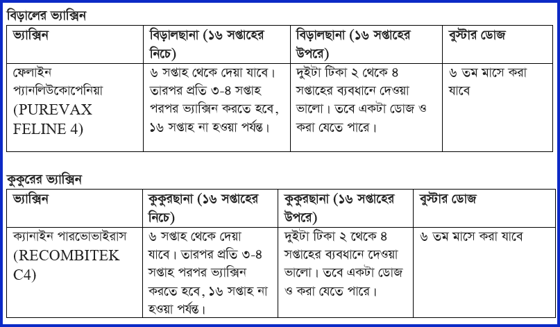 বাংলাদেশে এখন উপরে উল্লেখিত ভ্যাক্সিনগুলো খুব সহযে পাওয়া যাচ্ছে। যেগুলো ব্যবহার করে আমরা আমাদের পোষাপ্রাণীদের সুস্থ ও রোগমুক্ত জীবন দিতে পারি। বিড়ালের PUREVAX FELINE 4 কুকুরের জন্য RECOMBITEK C4 নামে বাজারজাত করছে স্কয়ার এগ্রোভেট ডিভিশন।